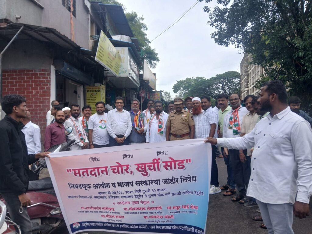 पिंपरी चिंचवड : मतदार यादीतील कथित घोटाळे, मतदान प्रक्रियेत हस्तक्षेप आणि निवडणूक आयोगावर दबाव टाकून गैरमार्गाने सत्ता मिळवल्याच्या आरोपांवरून भाजप सरकारविरोधात देहूरोड शहर काँग्रेस कमिटीने आज तीव्र आंदोलन केले. बाजारपेठेतून काढण्यात आलेल्या भव्य निषेध मोर्चाच्या माध्यमातून भाजपचा तीव्र शब्दांत जाहीर निषेध करण्यात आला.