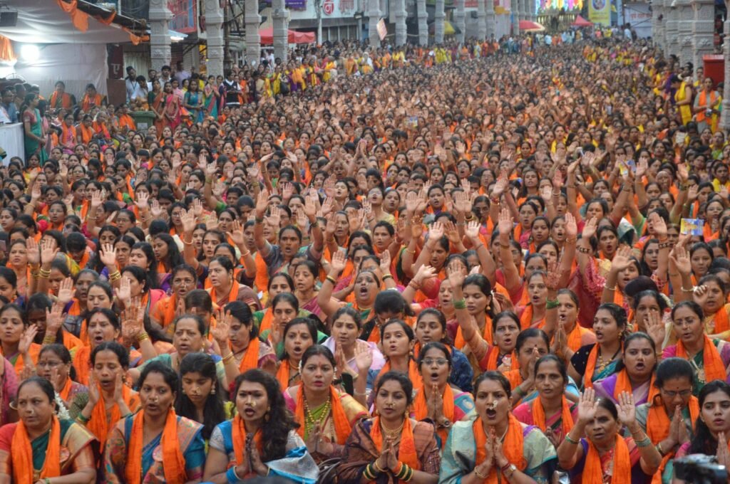 पुणे । “ॐ गं गणपतये नमः… ॐ नमस्ते गणपतये… मोरया… मोरया…” के गगनभेदी जयघोष के बीच पुणे के प्रसिद्ध श्रीमंत दगडूशेठ हलवाई गणपति मंदिर परिसर में गुरुवार को 35 हजार से अधिक महिलाएं एकत्र हुईं और सामूहिक रूप से अथर्वशीर्ष का पाठ किया। ऋषिपंचमी के पावन अवसर पर आयोजित इस अद्वितीय कार्यक्रम ने पूरे वातावरण को भक्तिरस और ऊर्जा से सराबोर कर दिया।