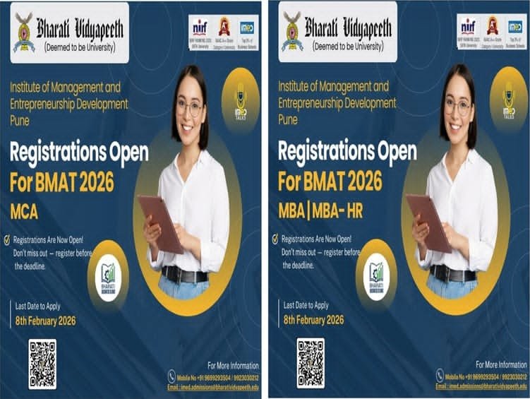 पुणे :भारती विद्यापीठ अभिमत विश्वविद्यालय के इंस्टीट्यूट ऑफ मैनेजमेंट एंड एंटरप्रेन्योरशिप डेवलपमेंट (आईएमईडी), पुणे की ओर से एमबीए, एमबीए एचआर तथा एमसीए पाठ्यक्रमों और प्रवेश प्रक्रिया की घोषणा की गई है। बी मैट 2026 प्रवेश परीक्षा के माध्यम से एमबीए, एमबीए एचआर और एमसीए पाठ्यक्रमों में प्रवेश दिया जाएगा। शैक्षणिक वर्ष 2026 के लिए प्रवेश हेतु आवेदन प्रक्रिया शीघ्र ही शुरू होने वाली है। प्रवेश प्रक्रिया से संबंधित अधिक जानकारी के लिए विद्यार्थियों को मोबाइल नंबर 9699293504, 9923030212 तथा ईमेल imed.admissions@bharatividyapeeth.edu पर संपर्क करने का अनुरोध किया गया है। इसके अतिरिक्त imed.bharatividyapeeth.edu इस वेबसाइट पर भी विस्तृत जानकारी उपलब्ध कराई गई है। संस्था की ओर से दी गई जानकारी के अनुसार इच्छुक और पात्र उम्मीदवारों को 8 फरवरी 2026 की अंतिम तिथि से पहले आवेदन करना आवश्यक है। प्रवेश 2026 के लिए इच्छुक विद्यार्थियों से कॉलेज से संपर्क कर तथा वेबसाइट देखकर अधिक जानकारी लेने और इस नवाचारी, अनुभव आधारित शिक्षण प्रणाली का लाभ उठाने की अपील की गई है।