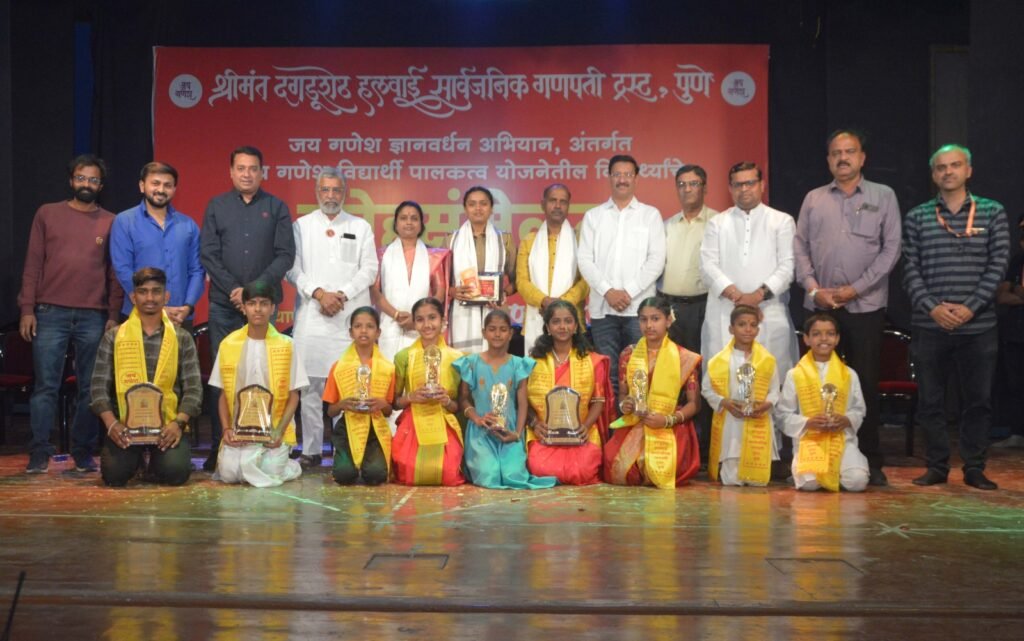 श्रीमंत दगडूशेठ हलवाई सार्वजनिक गणपति ट्रस्ट एवं सुवर्णयुग तरुण मंडल की ओर से ‘जय गणेश ज्ञानवर्धन अभियान’ के अंतर्गत ‘जय गणेश विद्यार्थी पालकत्व योजना’ से जुड़े विद्यार्थियों का स्नेह सम्मेलन एवं पुरस्कार वितरण समारोह तिलक स्मारक मंदिर में आयोजित किया गया। इस अवसर पर ट्रस्ट के अध्यक्ष सुनील रासने, कोषाध्यक्ष महेश सूर्यवंशी, उत्सव प्रमुख अक्षय गोडसे, सुवर्णयुग तरुण मंडल के मंगेश सूर्यवंशी, राजाभाऊ पायमोडे, पालकत्व योजना के विजय भालेराव, अजय मोझर सहित पदाधिकारी और कार्यकर्ता उपस्थित रहे।