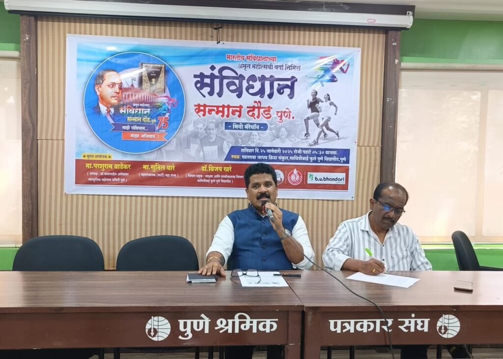 अमृत महोत्सवी संविधान सन्मान दौड २०२५ ची माहिती देताना परशुराम वाडेकर म्हणाले, डॉ. बाबासाहेब आंबेडकर सांस्कृतिक महोत्सव समिती पुणे, डॉ. बाबासाहेब आंबेडकर प्रशिक्षण व संशोधन संस्था (BARTI), संरक्षण आणि सामरिकशास्त्र विभाग, सावित्रीाईं फुले पुणे विद्यापीठ आणि पुणे जिल्हा हौशी अॅथलेटीक्स असोसिएशनच्या वतीने या ‘संविधान सन्मान दौड २०२५’चे आयोजन करण्यात आले आहे. स्पर्धेचे हे तिसरे वर्षे असून मागील वर्षी या स्पर्धेत तब्बल ५० देशांचे ५ हजाराहून अधिक स्पर्धक सहभागी झाले होते. तर यावर्षी सुमारे १० हजार स्पर्धक सहभागी होतील असा अंदाज आहे. यंदाची स्पर्धा २५ जानेवारी रोजी पहाटे ५.३० वाजता खाशाबा जाधव क्रीडा संकुल येथून सुरू होईल. राज्याचे उपमुख्यमंत्री अजित पवार, उच्च व तंत्रशिक्षण मंत्री चंद्रकांतदादा पाटील यांच्या हस्ते झेंडा दाखवून या स्पर्धेला सुरूवात होणार आहे. तर पारितोषीक वितरण केंद्रीय सामाजिक न्याय राज्यमंत्री रामदास आठवले, केंद्रीय सहकार राज्यमंत्री मुरलीधर मोहोळ, सामाजिक राज्यमंत्री माधुरी मिसाळ, सामजिक न्याय विभागाचे मुख्य सचिव डॉ. हर्षदीप कांबळे, बार्टी चे महासंचालक डॉ. सुनिल वारे,, सावित्रीबाई फुले पुणे विद्यापीठाचे कुलगुरू सुरेश गोसावी, पोलिस आयुक्त अमितेश कुमार, पुणे जिल्हाधिकारी जितेंद्र डूडी, सह पोलिस आयुक्त रंजन कुमार शर्मा, प्र कुलगुरू डॉ. पराग काळकर, रजिस्ट्रार ज्योती भाकरे, डॉ. विजय खरे ( विभाग प्रमुख संरक्षण आणि सामरिकशास्त्र विभाग, सावित्रीबाई फुले पुणे विद्यापीठ) यांच्यासह शहर आणि जिल्ह्यातील आमदार, विविध राजकीय पक्षांचे नेते आणि विविध क्षेत्रातील मान्यवर उपस्थित असणार आहेत. या स्पर्धेला आमदार सिद्धार्थ शिरोळे, आमदार अण्णा बनसोडे यांचे विशेष सहकार्य लाभाल्याचे वाडेकर यांनी सांगितले.