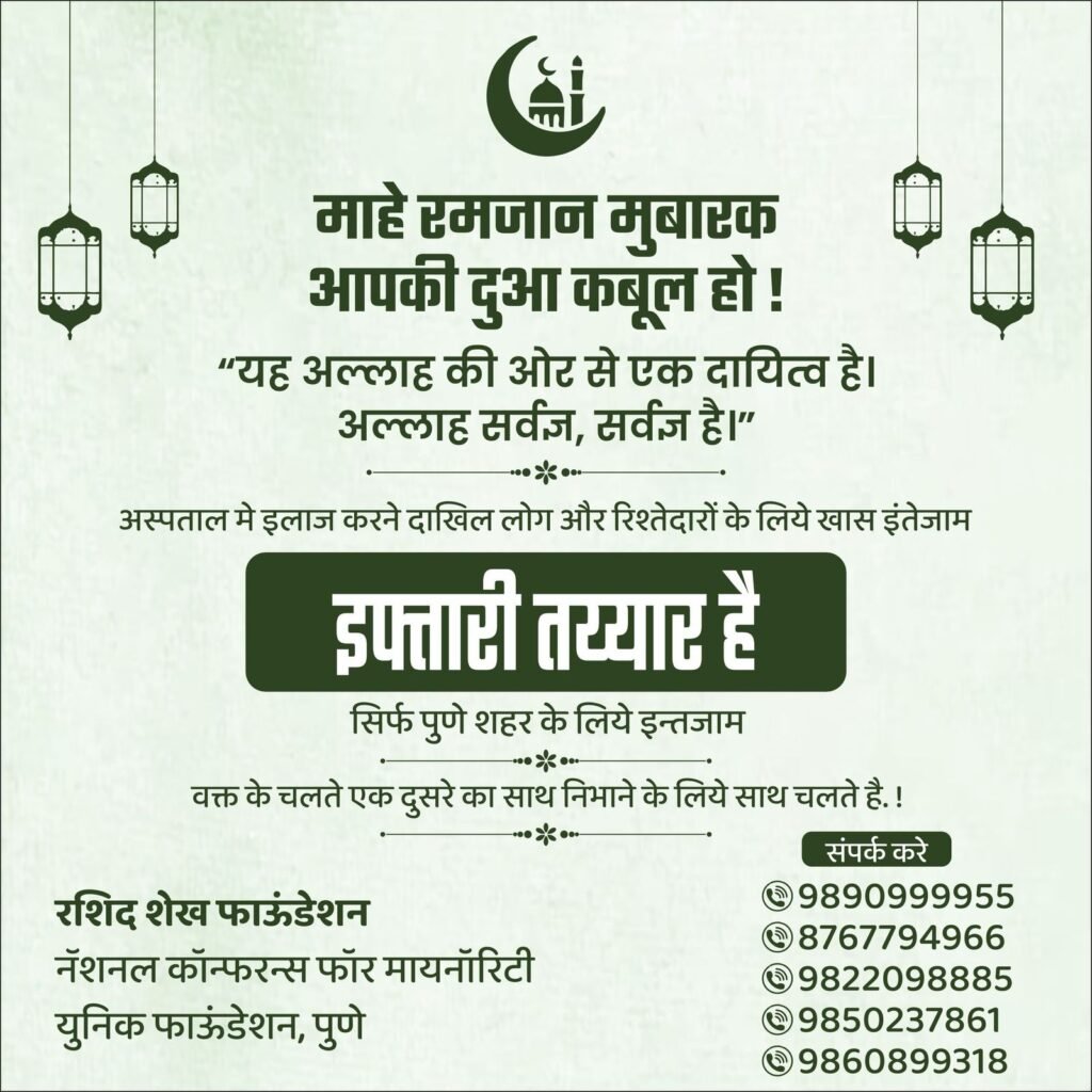 दरम्यान हॉस्पिटलमधे उपचारार्थ दाखल असणाऱ्या पेशंट व त्यांच्या नातेवाईकांना इफ्तारी भोजनाची व्यवस्था केली आहे याची माहिती व्हावी यासाठी आपण सर्वांनी प्रयत्न करावा व यासाठी 9890999955 / 8767794966 या नंबरवर संपर्क करावा असे अवाहन देखिल यावेळी करण्यात आलेली आहे.