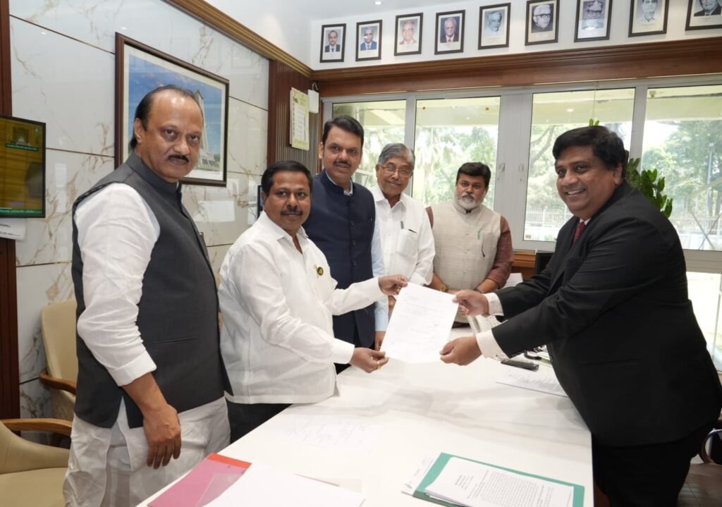 पुणे . विधानसभा उपाध्यक्षपदासाठी उद्या, बुधवार दि. 26 मार्च 2025 रोजी होणाऱ्या निवडणुकीसाठी अर्ज भरण्याचा आज (25 मार्च) शेवटचा दिवस असून राष्ट्रवादी काँग्रेस, भाजप, शिवसेना आणि मित्रपक्षांच्या महायुतीच्या वतीने राष्ट्रवादी काँग्रेसचे पिंपरीचे आमदार श्री. अण्णा बनसोडे यांनी आज आपला अर्ज दाखल केला. यावेळी मुख्यमंत्री देवेंद्र फडणवीस, उपमुख्यमंत्री अजित पवार, संसदीय कार्यमंत्री चंद्रकांत (दादा) पाटील, उद्योगमंत्री उदय सामंत आदी मान्यवर यावेळी उपस्थित होते.