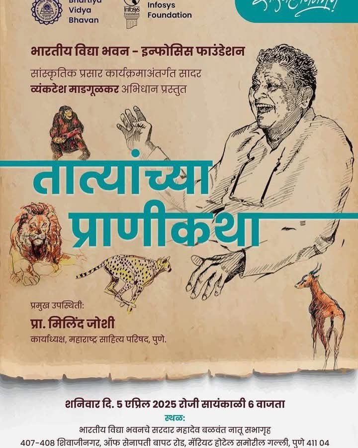 पुणे. भारतीय विद्या भवन और इन्फोसिस फाउंडेशन के सांस्कृतिक प्रसार कार्यक्रम के अंतर्गत ‘तात्या की प्राणीकथाएँ’ कार्यक्रम का आयोजन किया जा रहा है। मराठी कथा के शिल्पकार, वन्यजीवन विशेषज्ञ और चित्रकार कै. व्यंकटेश माडगूळकर की जयंती के उपलक्ष्य में उनकी प्राणीकथाओं पर आधारित यह दृश्य-श्रव्य कार्यक्रम प्रस्तुत किया जाएगा। यह कार्यक्रम शनिवार, 5 अप्रैल 2025 को शाम 6 बजे ‘भारतीय विद्या भवन’ के सरदार महादेव बळवंत नातू सभागृह (सेनापति बापट रोड) में आयोजित होगा।’व्यंकटेश माडगूळकर अभिधान’ द्वारा प्रस्तुत इस कार्यक्रम में महाराष्ट्र साहित्य परिषद के कार्याध्यक्ष प्रो. मिलिंद जोशी मुख्य अतिथि के रूप में उपस्थित रहेंगे।