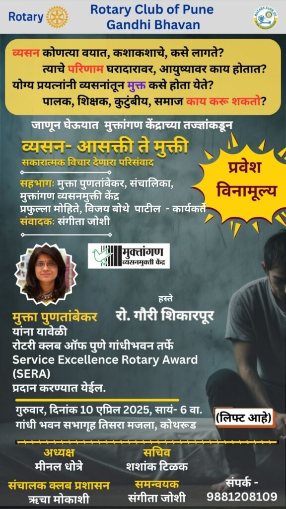 पुणे .’रोटरी क्लब ऑफ पुणे गांधी भवन’ की ओर से ‘व्यसन-आसक्ती से मुक्ति’ विषय पर परिसंवाद का आयोजन किया गया है। यह परिसंवाद गुरुवार, दिनांक 10 अप्रैल 2025 को शाम 6 बजे गांधी भवन (कोथरूड) की तीसरी मंज़िल पर स्थित सभागार में आयोजित किया जाएगा। इस परिसंवाद में मुक्तांगण व्यसनमुक्ति केंद्र की संचालिका मुक्ता पुणतांबेकर, प्रफुल्ला मोहिते और विजय बोटे-पाटील जैसे कार्यकर्ता भाग लेंगे। इनसे संवाद की भूमिका संगीता जोशी निभाएंगी।