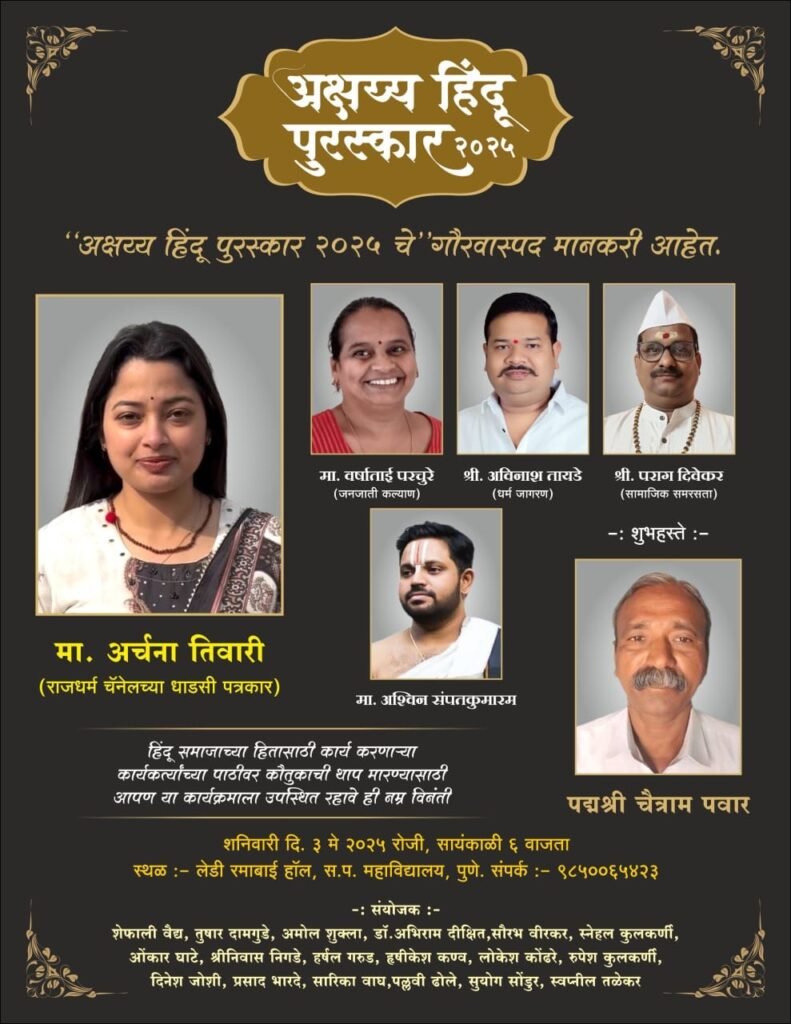 पुणे . हिंदू हितासाठी कार्य करणाऱ्या देशभरातील कार्यकर्त्यांना हयूमनिस्ट युनियन ट्रस्ट तर्फे ‘अक्षय्य हिंदू पुरस्काराने’ गौरविले जाते. यंदा हा पुरस्कार वितरण सोहळा शनिवार, दिनांक ३ मे रोजी सायंकाळी ६ वाजता स. प. महाविद्यालयातील लेडी रमाबाई हॉल येथे होणार आहे. यावेळी पद्मश्री पुरस्कार विजेते चैत्राम पवार हे उपस्थित राहणार आहेत, अशी माहिती समितीचे तुषार दामगुडे यांनी दिली.