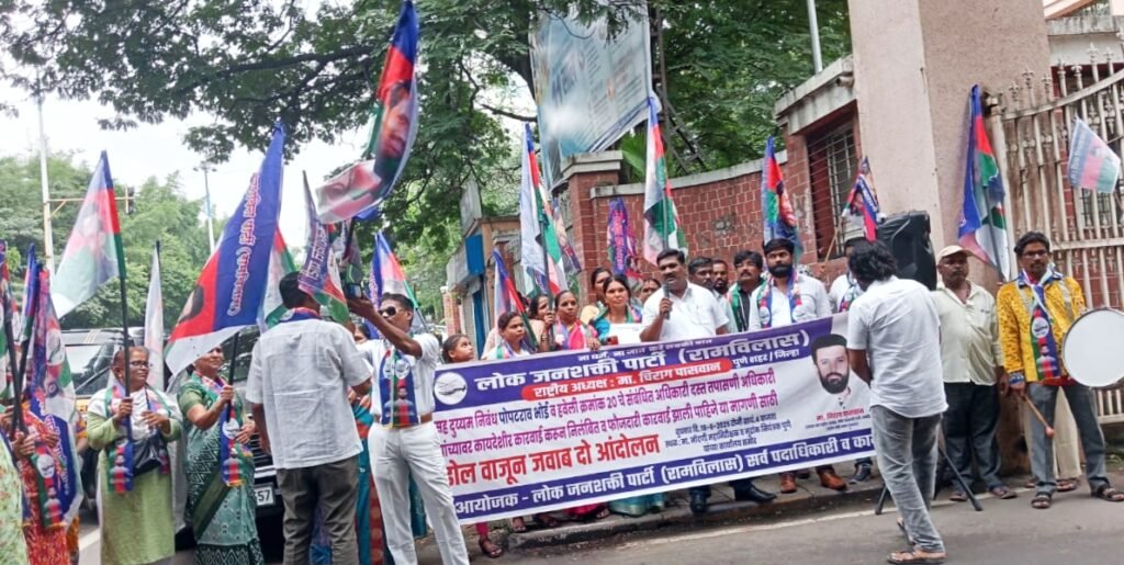 पुणे : सह-दुय्यम निबंधक हवेली क्र.२० मधील बेकायदेशीर दस्त नोंदणी, भ्रष्ट कारभाराविरुद्ध लोक जनशक्ती पार्टी (रामविलास) पक्षा ने आज १८ जून २०२५ रोजी सायंकाळी ‘जवाब दो’आंदोलन करण्यात केले.हवेली क्र.२० चे अधिकारी सह-दुय्यम निबंधक पोपटराव भोई यांच्यावर कायदेशीर कारवाई करून निलंबित करणे बाबत नोंदणी महानिरीक्षक व मुद्रांक नियंत्रक महाराष्ट्र राज्य शासकीय इमारत यांच्या कार्यालयासमोर(कौन्सिल हॉल समोरील नवीन प्रशासकीय इमारत येथे) ढोल वाजवून ‘जवाब दो’ आंदोलन करण्यात आले.