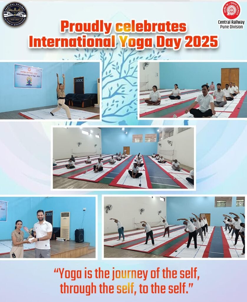 पुणे.पुणे मंडल, मध्य रेलवे ने 21 जून 2025 को 11वें अंतर्राष्ट्रीय योग दिवस को बड़े उत्साह के साथ मनाया, जो इस वर्ष के थीम- “एक पृथ्वी, एक स्वास्थ्य के लिए योग” के अनुरूप था। यह आयोजन मंडल द्वारा अपने कर्मचारियों और उनके परिवारों के बीच स्वास्थ्य, जागरूकता और समग्र स्वास्थ्य को बढ़ावा देने की प्रतिबद्धता को दर्शाता है।