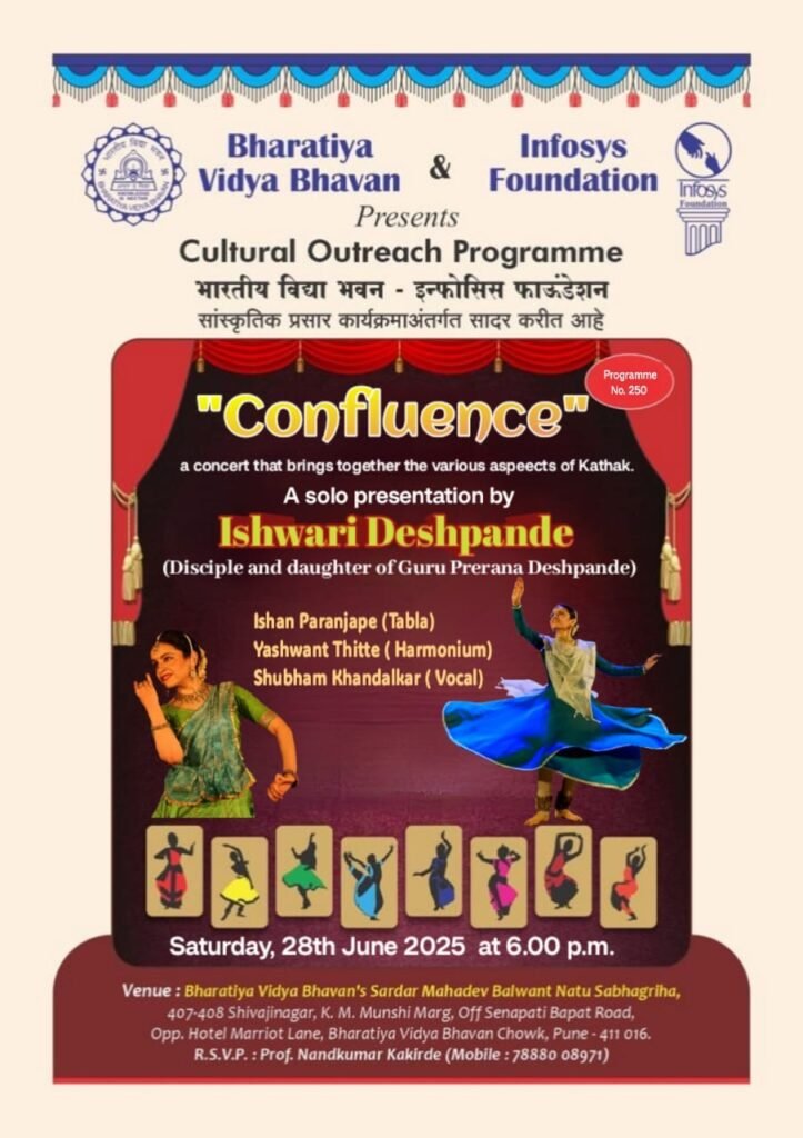 पुणे: भारतीय विद्या भवन और इन्फोसिस फाउंडेशन के सांस्कृतिक प्रसार कार्यक्रम के अंतर्गत ईश्वरी देशपांडे की एकल कथक नृत्य प्रस्तुति शनिवार, 28 जून 2025 को सायं 6 बजे भारतीय विद्या भवन के सरदार महादेव बळवंत नातू सभागार, सेनापति बापट रोड, पुणे में आयोजित की गई है। ईश्वरी देशपांडे, वरिष्ठ कथक नृत्यगुरु प्रेरणा देशपांडे की पुत्री और शिष्या हैं। इस कार्यक्रम में तबले पर ईशान परांजपे, संवादिनी पर यशवंत थिटे ,
