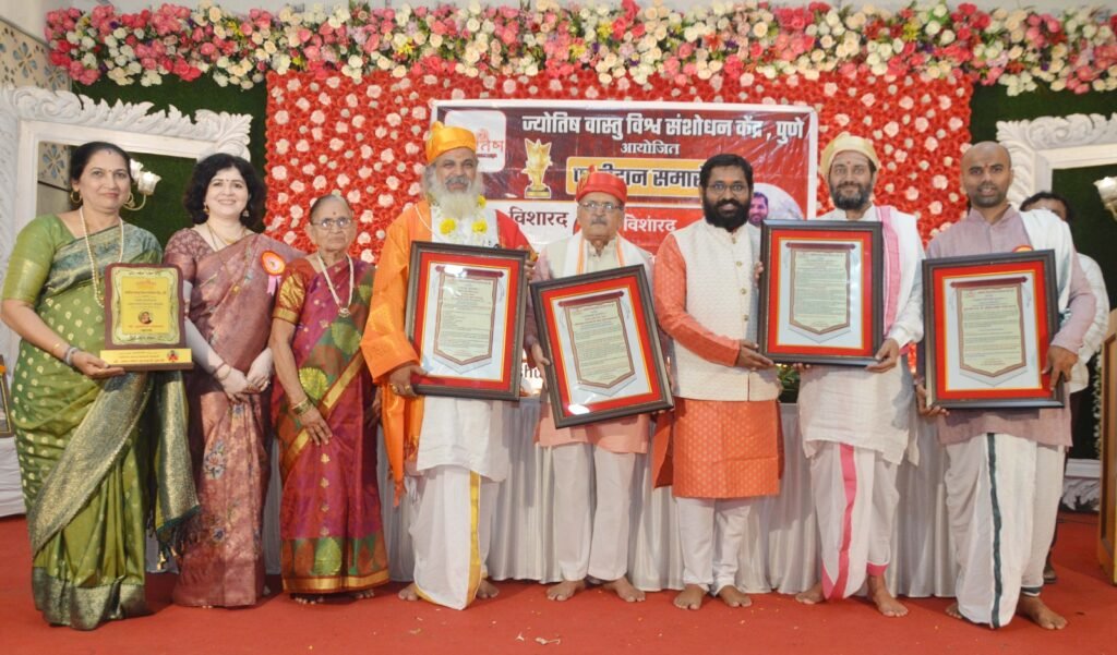 ज्योतिष वास्तू विश्व संशोधन केंद्र, पुणे यांच्या वतीने चतुर्थ पदवी प्रमाणपत्र वितरण व पुरस्कार सोहळ्याचे भव्य आयोजन पद्मावती येथील विणकर सभागृहात करण्यात आले. यावेळी ज्येष्ठ ज्योतिषतज्ञ शुभांगिनी पांगारकर, संस्थेचे अध्यक्ष वेदमूर्ती उमेश रमेश कुलकर्णी गुरुजी उपस्थित होते. विद्यावाचस्पती ज्येष्ठ गाणपत्य डॉ. स्वानंद पुंड महाराज यांना शारदा पुरस्कार, अभिनव ज्योतिष मंडळ सोलापूर या संस्थेचे अध्यक्ष ज्येष्ठ पंचांगकर्ते मोहन दाते यांना रत्नमाला पुरस्कार, योगीराज वेद विज्ञान आश्रम या पाठशाळेचे अध्यक्ष अश्वमेघयाजी चैतन्य नारायण काळे गुरुजी यांना वेद संवर्धन प्रेरणा पुरस्कार, वेदमूर्ती दत्तात्रय मनोहर साधले गुरुजी यांना वेदमार्ग दीपस्तंभ पुरस्कार प्रदान करण्यात आले.