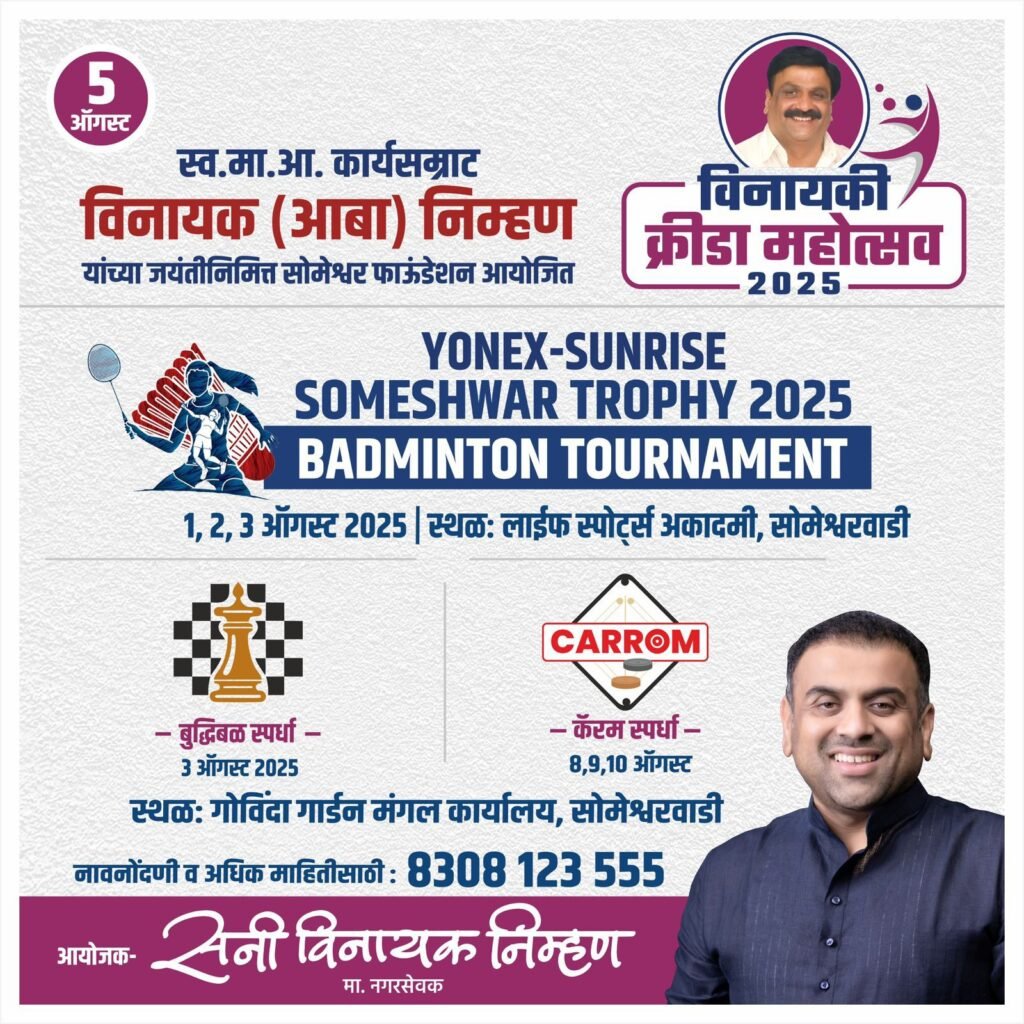 पुणे: सोमेश्वर फाउंडेशन यांच्या वतीने आयोजित माजी आमदार कै. विनायक निम्हण यांच्या जयंती निमित्त विनायकी क्रीडा महोत्सवाचे 1 ते 10 ऑगस्ट 2025 या कालावधीत आयोजन करण्यात आले आहे. यामध्ये राज्यस्तरीय बॅडमिंटन, बुद्धिबळ, कॅरम स्पर्धा घेण्यात येणार आहेत.