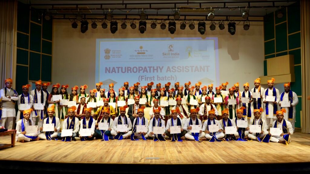 पुणे, 5 अगस्त 2025.आज निसर्गग्राम, राष्ट्रीय प्राकृतिक चिकित्सा संस्थान, पुणे में प्राकृतिक चिकित्सा सहायक के प्रथम बैच के लिए प्रमाण पत्र वितरण समारोह का आयोजन हेल्थ सेक्टर स्किल काउंसिल (HSSC) के सहयोग से किया गया। यह अवसर गर्व और उपलब्धि का प्रतीक रहा, जिसमें कौशल आधारित 480 घंटे का प्रशिक्षण सफलतापूर्वक पूरा करने वाले विद्यार्थियों को सम्मानित किया गया।