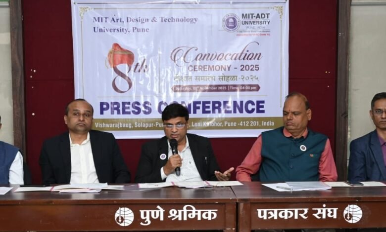 पुणे : विश्वराजबाग, पुणे स्थित एमआईटी आर्ट, डिजाइन एवं टेक्नोलॉजी विश्वविद्यालय (एमआईटी एडीटी) का 8वां दीक्षांत समारोह शनिवार, दिनांक 8 नवम्बर 2025 को दोपहर 4:00 बजे भव्य रूप से आयोजित किया जा रहा है। यह समारोह राजस्थान के राज्यपाल माननीय श्री हरिभाऊ बागडे की प्रमुख उपस्थिति में तथा विश्वधर्मी प्रा. (डॉ.) विश्वनाथ दा. कराड की अध्यक्षता में स्वामी विवेकानंद मंडप, लोणी कालभोर, विश्वराजबाग परिसर में संपन्न होगा।