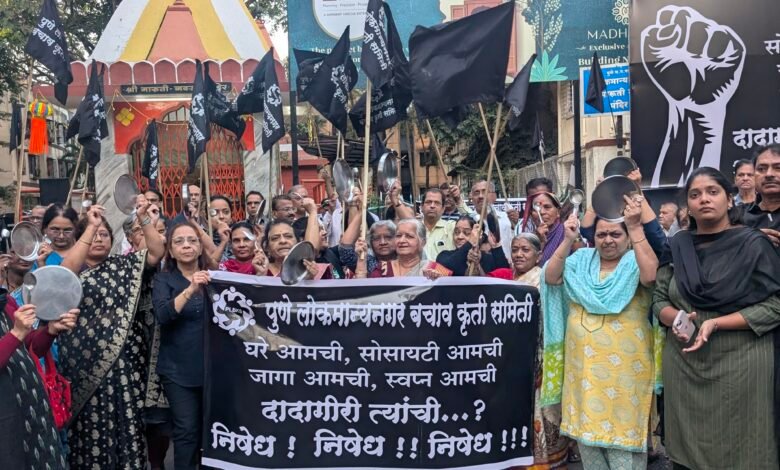 पुणे : लोकमन्यनगर बचाव कृती समिति की ओर से लोकमन्य नगर के दत्त मंदिर चौक में नागरिकों ने अभूतपूर्व घंटानाद आंदोलन किया। थालियां, घंटे, काले झंडे और काले कपड़े पहनकर सैकड़ों नागरिक एकत्र हुए और पूरा दत्त मंदिर चौक जोरदार नारों से गूंज उठा। लोकमन्यनगर पुनर्विकास मुद्दे पर कई दिनों से बढ़ता असंतोष आज के आंदोलन में उभरकर समोर आया। “घर हमारा हक का है, किसी के बाप का नहीं!”, “सरकार का करना क्या—नीचे सिर, ऊपर पैर!”, “लोकमन्यनगर पर अन्याय अब बर्दाश्त नहीं!” ऐसे मजबूत नारों ने माहौल गर्म कर दिया।