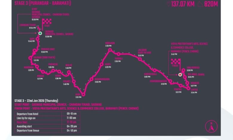 पुणे : अंतरराष्ट्रीय साइक्लिंग प्रतियोगिता ‘बजाज पुणे ग्रैंड टूर–2026’ के अंतर्गत तीसरे चरण का आयोजन आज सासवड से बारामती के बीच किया जाएगा। इस चरण की शुरुआत दोपहर 12.30 बजे सासवड नगर परिषद क्षेत्र स्थित चंदन टेकड़ी से होगी, जबकि समापन बारामती के विद्या प्रतिष्ठान कला, विज्ञान एवं वाणिज्य महाविद्यालय में किया जाएगा। इस दौरान सासवड और बारामती तालुकों के नागरिकों को देश-विदेश के नामांकित साइक्लिस्टों का कौशल प्रत्यक्ष देखने का अवसर मिलेगा।
