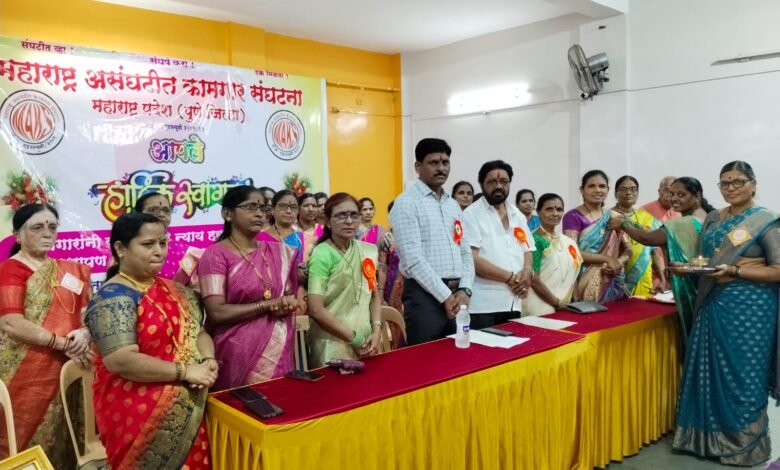 पुणे : महाराष्ट्र असंघटित कामगार संघटना, पुणे जिल्हा यांच्या वतीने जागतिक महिला दिनानिमित्त घरेलू महिला कामगार मेळाव्याचे आयोजन धनकवडी येथील राजमुद्रा संस्कृती भवन येथे सोमवार, दि. ९ मार्च २०२६ रोजी उत्साहात करण्यात आले. या मेळाव्यात मोठ्या संख्येने महिला कामगार सहभागी झाल्या.