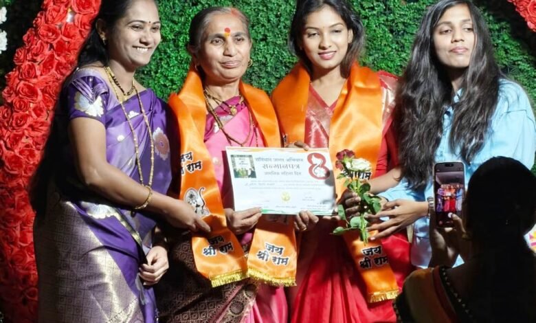 जगातील महिला दिना निमित्त भाग्यश्री मंगल कार्यालयात आदर्श सासू – गुणी सून’ या अनोख्या उपक्रमासह विविध क्षेत्रांतील कर्तृत्ववान महिलांचा गौरव सन्मानपत्र, श्रीफळ, स्नेहवस्त्र, गुलाबपुष्प देऊन सन्मानित करण्यात आले.